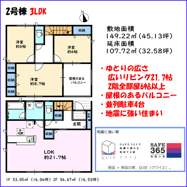 【外観】◎ハザードにかからない安心のお住まい◎最寄駅まで徒歩9分の至近◎リビングに洋風和室3.7帖◎屋根のあるバルコニー◎並列駐車3台★新築住宅の購入は三幸住宅にお任せください♪